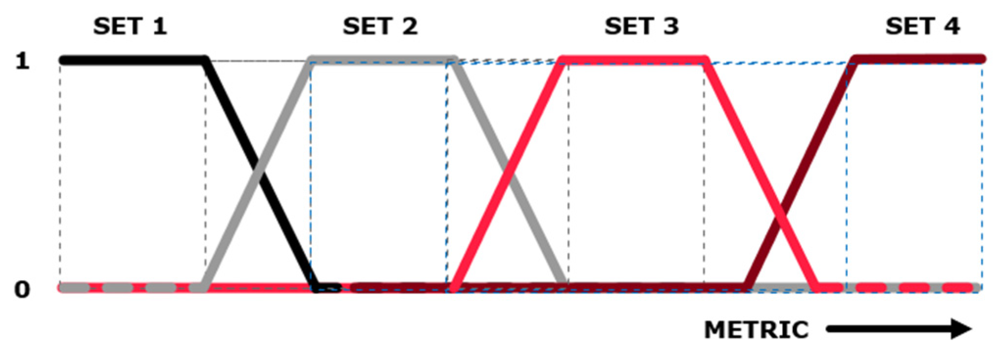 Fuzzification of the input variables: all crisp metrics are evaluated to determine the degree of membership in the defined fuzzy sets.