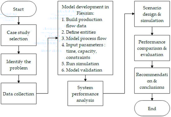 We employed a case-based, simulation-driven approach to analyze and optimize a real-world production system. The methodology includes data collection, model development using FlexSim, model validation, performance analysis, and scenario development to identify inefficiencies and examine alternative configurations for enhanced operational performance without disrupting actual procedures. FlexSim simulation software is utilized as the primary tool for visualizing workflows, identifying bottlenecks, and testing improvements. Figure 1 illustrates the overall research workflow.