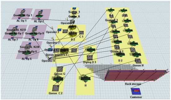 The industry chosen for the case study was a medium-scale industry, where operators are responsible not only for the main production tasks but also for additional activities outside the primary production process. Figure 2 illustrates the production process layout modeled in FlexSim. Yellow areas represent the main production process stations, while purple areas indicate locations where operators perform activities outside the primary manufacturing process. These non-primary activities are included in the calculation of operator utilization, even though the activities are not directly part of the main manufacturing process. The connecting lines illustrate the assignment and interaction between operators and specific operations within the system.