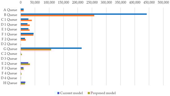 Comparison of average queue times between the current and proposed models.