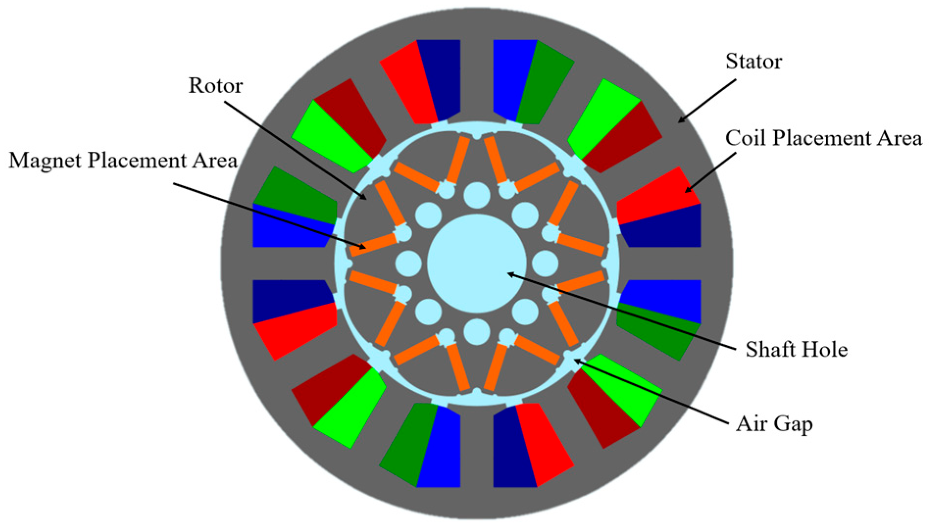 Various types of permanent magnets can be employed in motor design, including Alnico, ferrite, samarium–cobalt (SmCo), and neodymium–iron–boron (NdFeB) magnets. In this study, NdFeB magnets were chosen for motor design due to their superior magnetic properties and relatively lower cost compared with SmCo magnets. Owing to this balance of performance and affordability, NdFeB magnets are widely adopted in high-performance motor applications.