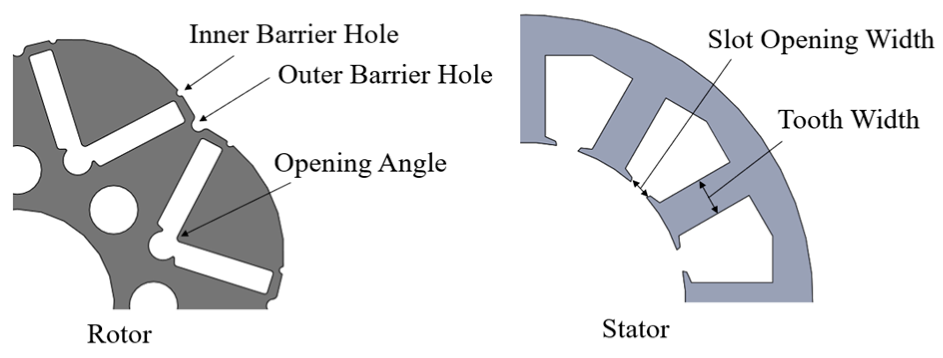 Sensitivity analyses were performed on the rotor span angle, inner and outer flux barrier holes, tooth width, and slot opening to determine suitable parameter ranges, which were subsequently used in the Taguchi optimization process.
