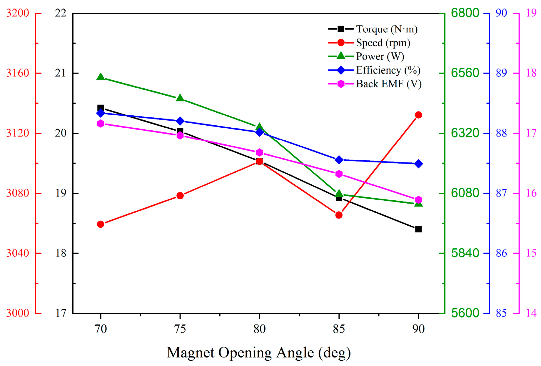 Figure 3 shows the results of the sensitivity analysis for the rotor span angle. Smaller span angles generally provide better output performance, except for rotational speed. However, when the span angle increases from 80° to 85°, a significant drop in performance is observed. At 80°, the motor speed reaches a peak of approximately 3100 rpm. Therefore, the 80° span angle was selected as the baseline geometry for subsequent optimization analysis.