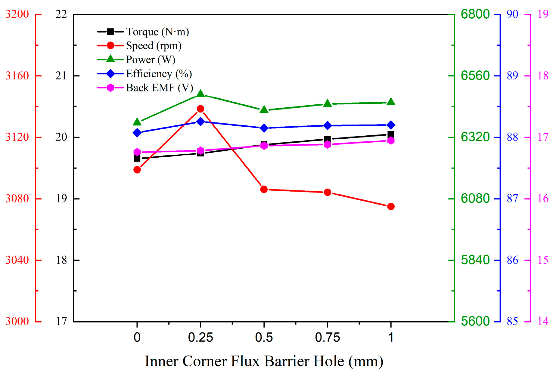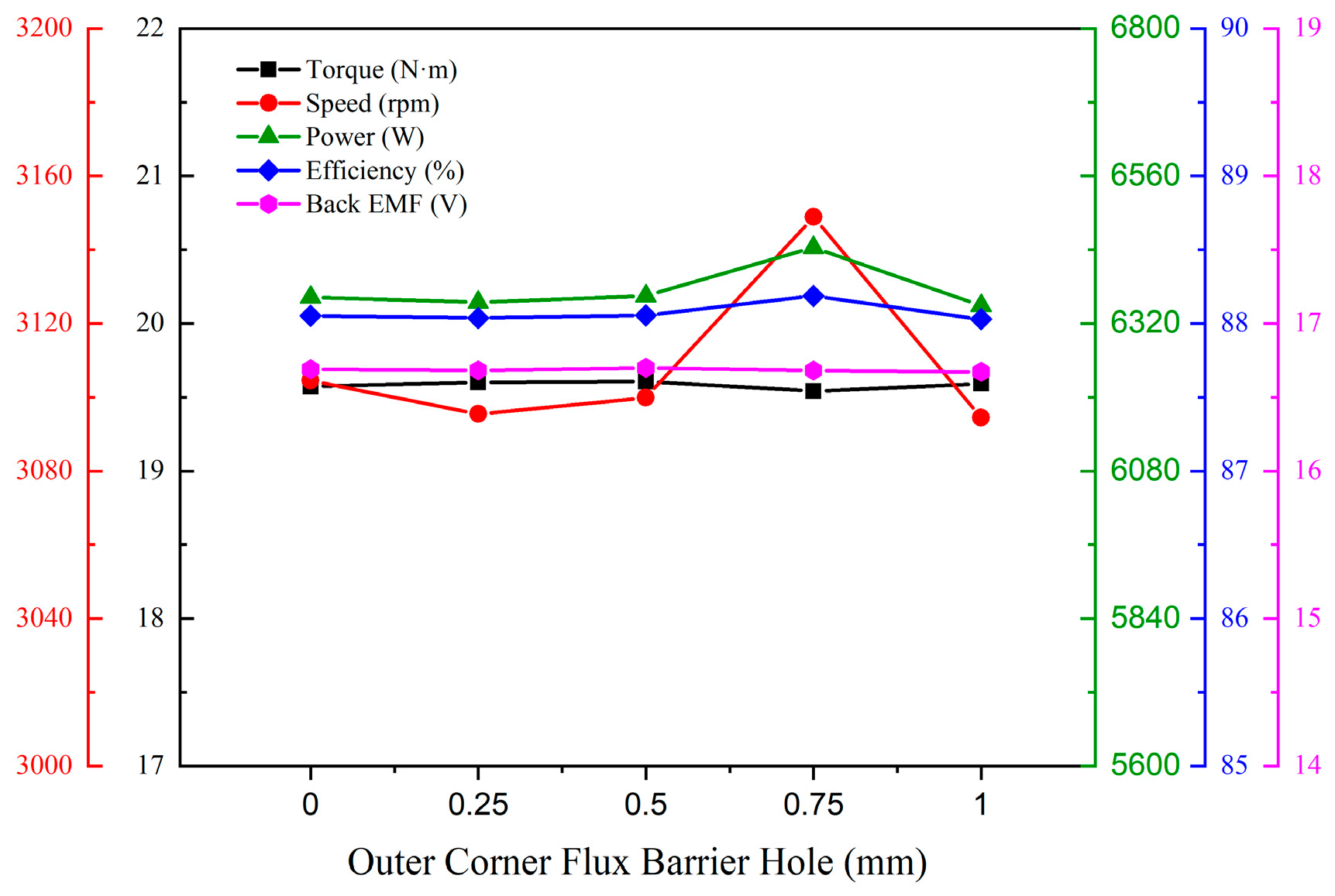 Figure 5 shows the results of the sensitivity analysis for the outer flux barrier holes. Similar to the inner barrier holes, the variations in this parameter exhibit little effect on back EMF and torque. However, at a barrier hole size of 0.75 mm, the motor speed, output power, and efficiency are significantly higher than those of other sizes, while torque and back EMF are relatively lower. Accordingly, three levels—0.25, 0.5, and 0.75 mm—were selected as the design range for the subsequent Taguchi optimization.
