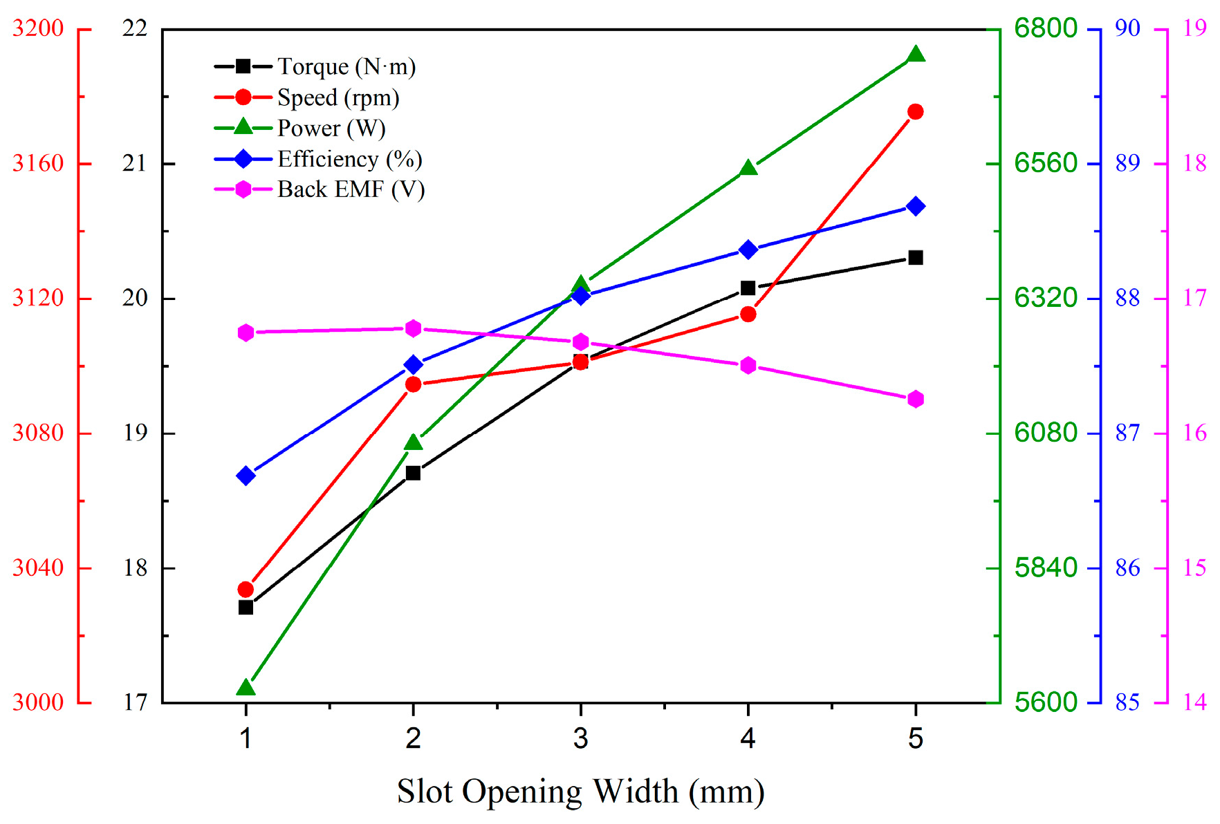 Figure 6 presents the results of the sensitivity analysis for tooth width. A smaller tooth width yields better performance in terms of speed, output power, and efficiency, whereas torque and back EMF exhibit poorer performance. A balanced intermediate width provides more stable characteristics. Therefore, 5, 6, and 7 mm were selected as the design levels for subsequent Taguchi optimization.