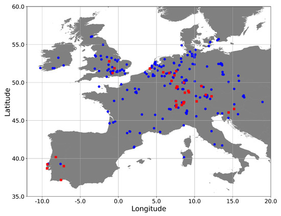 Locations of all synchronized stations: the initial set of 35 synchronized stations is marked by red squares, all the other stations by blue circles.