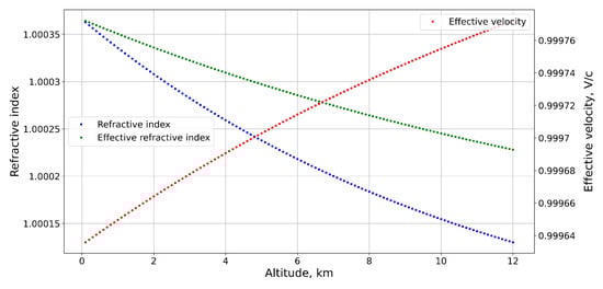 Altitude profiles for refractive index (blue curve), effective refractive index (green curve) and effective radio wave velocity (red curve) in the atmosphere at different aircraft altitudes. Profiles were calculated using the radio wave velocity model described in Section 2.1.