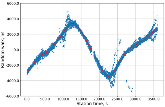 Random walk of one station’s clock after eliminating linear clock drift. Blue points denote time residuals from Equation (11); the red solid line is a fitted cubic spline which is used to model this random walk.