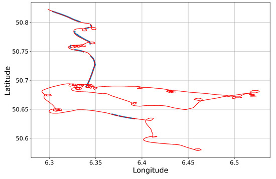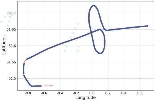 The next step in aircraft track reconstruction was predicting locations where less than three stations’ timestamps were available and to replace outliers. The author applied the method developed by him in round one. Latitude and longitude values of predicted aircraft locations were separately fitted as second order polynomial functions of aircraft time using the Huber regression algorithm within a time window of 30 s. Huber regression was used here as a robust algorithm against outliers. A minimum of 10 points within the 30 s time window were found to be required in order to achieve decent and robust results. An example of predicted aircraft track is presented at Figure 4.