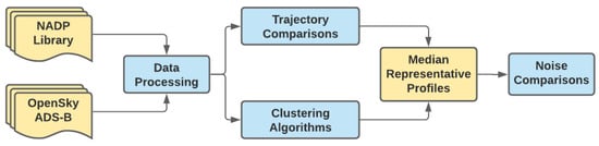 The overall methodology followed in this study is outlined in Figure 1. Trajectory comparison is accomplished to gain insights into the similarity between the defined NADP and real-world procedures. Clustering algorithms are utilized to group similar real-world procedures and reduce each group to a single median representative FPP for noise modeling. Finally, noise results are compared to quantify the difference in environmental impacts arising from variability in real-world trajectories.