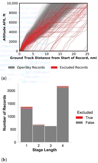 In this study, 1-year departure data of B737-800 at the San Francisco International Airport (KSFO) for the year 2019 were selected for analysis. ADS-B altitude and ground speed data were extracted from OpenSky Network’s [14] historical database for departing aircraft. The dataset obtained contains 5170 flight records from 10 airlines. Flight great-circle distance is computed from origin-destination pair information and converted to stage lengths as a proxy for takeoff weight, enabling comparison against NADP procedural profiles of the same stage length. The OpenSky dataset is then processed to remove 123 departures that do not cross 10,000 ft altitude above Mean Sea Level (MSL) at cumulative ground track distance of 25 nmi or possessing a vertical speed below 200 ft/min for ground track distance longer than the maximum runway length of 2 nmi at KSFO. These two criteria are selected to remove flights that do not represent typical departure procedures observed within the dataset. Figure 2 illustrates the flights removed from the analysis.