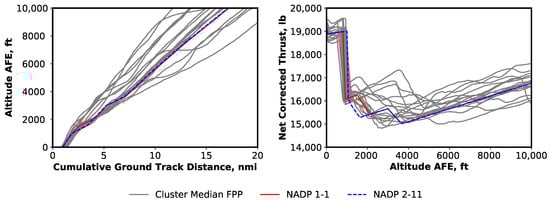 Noise Abatement Departure Procedures (NADPs) are one of the many noise mitigation measures used at airports. A study by Lim et al. [9] surveyed a set of 20 different NADP profiles, each with combinations of varying thrust cutback, initial acceleration, and final acceleration altitudes. The library is subdivided into NADP 1 and NADP 2 based on “Close-in” and “Distant” benefits, respectively [3]. These definitions can be represented in AEDT as procedural profiles for modeling average departure procedures at an airport and expanded based on combinations of AEDT weights and reduced thrust (RT) levels [7]. However, including such a high number of profiles as modeling options in AEDT was undesirable. In order to reduce the number of NADP profile combinations, previous studies by Behere et al. [10] demonstrated the use of clustering techniques to group NADP profiles based on performance and environmental metrics. The NADP profile clusters were then compared against a small sample of high-fidelity real-world flight data from a single airline with weight and thrust information. NADP 1-1 and NADP 2-11 profiles were recommended for implementation in AEDT based on their ability to consistently represent real-world operations across a variety of aircraft types and airports [11].