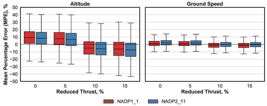 Altitude comparison results indicate that NADP 1-1 RT10 (90% takeoff thrust and 90% climb thrust) is the most representative with a median of 4.96% under-prediction by NADP and an interquartile range (IQR) of 8.63%. NADP 2-11 RT10 is the second most representative with a median of 5.91% under-prediction. For ground speed, the most representative case is NADP 2-11 RT10 with a median of 0.18% under-prediction and an IQR of 2.89%. The median ground speed difference for NADP 1-1 RT10 is 1.25% under-prediction.