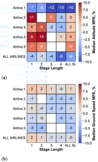 Trajectory difference between NADP2-11 RT10 and real operations by airline–stage length; positive MPE indicates NADP is higher. (a) Altitude; (b) ground speed.