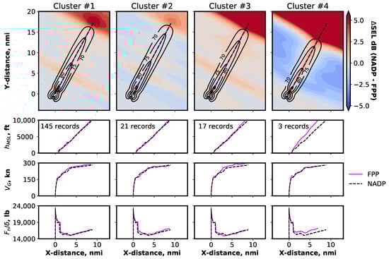 Figure 6 illustrates the difference in sound exposure level (SEL dB) results for the airline–stage length group with the minimum overall trajectory difference. Red regions indicate that more noise is produced while blue regions indicate less noise is produced by NADP as compared to cluster median FPPs. Contour lines overlaid on heat maps show the noise result of each cluster median FPP. Since profiles are modeled up to 10,000 ft MSL, noise differences toward the top right where one of the profiles may have terminated prior to the other should be ignored. Uncertainties also exist at the start of flight due to takeoff ground roll and thrust cutback altitude assumptions. Cluster #4 has the most considerable difference prior to the end of the profile but is a less common flight operation containing only three flight records.