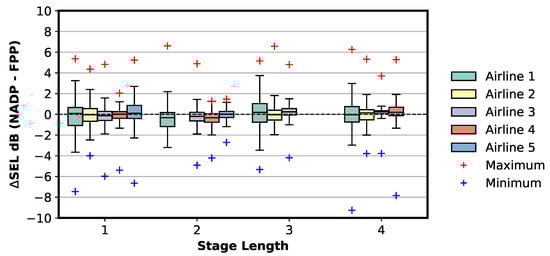 Figure 7 shows the variability within the 70 SEL dB contour area with all cluster medians in each airline–stage length group aggregated together, excluding single flight clusters. The shorter trajectory’s 70 SEL dB contour area is used as the reference area to exclude the end of profile errors. The majority of noise differences are observed to be within ±2 SEL dB, with maximum and minimum noise differences within +8 and −10 SEL dB, respectively. No significant bias towards over-prediction or under-prediction was observed. Note that NADP profiles are meant to represent a typical operation averaged across all real-world operations. As such, Figure 6 and Figure 7 should be interpreted as the variability in the noise grid within a single airline and across multiple airlines not captured when using NADP definitions to represent real-world operations.