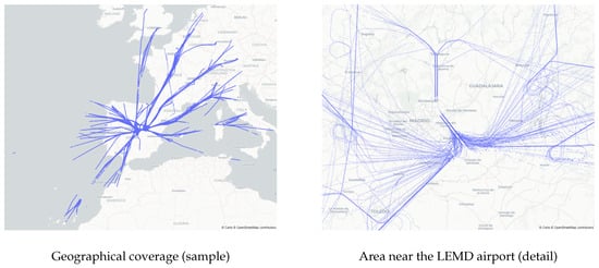 We used the OpenSky Network [12] as the main data source. We also used flight plan data from Network Manager (https://www.eurocontrol.int/network-operations, accessed on 17 November 2021) (managed by EUROCONTROL) to help to identify individual trajectories in the raw OpenSky data, and provide a landing time whenever it can not be inferred from ADS-B data. A total of 9190 flights are included in the dataset, of which 2118 correspond to domestic flights (flights coming from other Spanish airports) and 7072 to international flights. Figure 1 displays an overview of the geographical coverage (left) and the vector density (right) of the dataset.