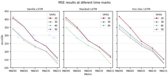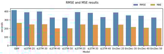 At a first glance, smaller models perform worse than models with a higher number of LSTM units. This may occur because smaller sequence sizes in these models are not long enough to identify many of the relevant patterns in the input data. It might also be that the models have an insufficient capacity to correctly fit the data, and the error we are observing is due to bias error of the models themselves. However, sLSTM and Enc-Dec models, each with two layers of 20 LSTM units, do not improve the results of vLSTM albeit their higher capacity, which enforces the first hypothesis: input sequences are too short. All models increase their performance when 40 or more units are used, with a MAE lower at about 40–50 s (a 20% lower mean absolute error), and this keeps improving slightly if we increase the number of units to 50. LSTM-50 is the best model, with a MAE value of 200 s (3.33 min) versus 264 s from GBM (4.4 min) and 208.23 from EncDec-40 (3.47 min).