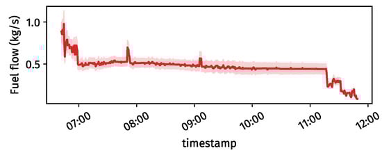 The calculation of fuel flow and emissions relies not only on flight trajectory data but also requires knowledge of aircraft mass. Aircraft mass data are not publicly available, but it is one of the parameters that greatly influences performance calculation. In order to handle unknown aircraft mass, we calculated four different emissions based on four assumptions of mass for each flight. These masses are defined at 60%, 70%, 80%, and 90% of the aircraft’s maximum take-off weight. Figure 2 shows the estimated fuel from the previous example trajectory, as well as the uncertainty boundaries caused by unknown aircraft mass.