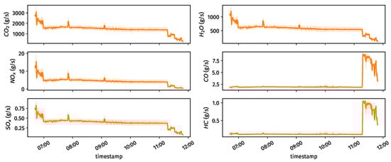 Base on the fuel flow and additional emission models from OpenAP, other types of emissions for the same trajectory are calculated. The examples of these emissions and their uncertainties are shown in Figure 3.
