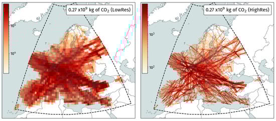 Since emissions are calculated at each trajectory level and labeled with different attributes, it is convenient to aggregate the results according to these features. First of all, we can visualize emission at different spatial resolutions. The two plots in Figure 4 illustrate one day of CO2 emission at 1-degree and 0.1-degree grids over Europe.