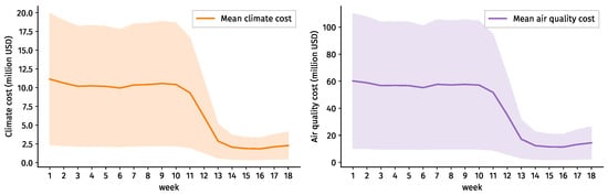 Based on different types of emissions, the aforementioned global environmental costs, including climate costs and air quality costs, are calculated and shown in Figure 6. We obtain the uncertainty in the cost by cost value samples based on Monte Carlo simulations (100,000 samples) obtained from []. The confidence intervals represent the standard deviations in cost estimations by using these cost samples.