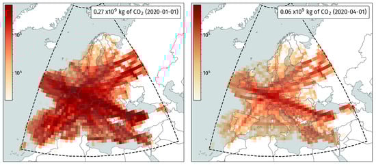 In order to further examine emissions reductions, we illustrate CO2 emissions on two different days before and at the start of the COVID-19 pandemic in Figure 7. By comparing CO2 emissions on 1 January and 1 April 2020, we find that the level of CO2 emission decreased by about 80% due to the shutdowns in aviation, which also corresponds with traffic reductions observed in [].