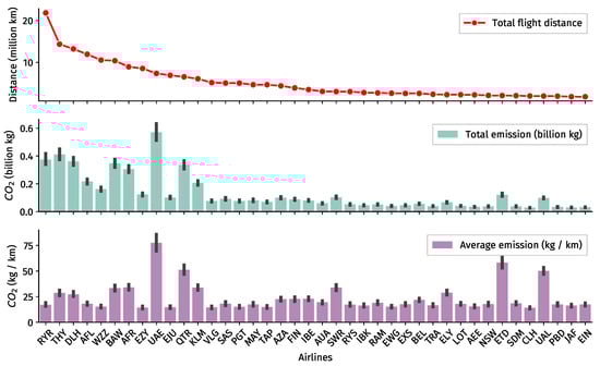 With additional information on flight operators, we can further dissect estimated emissions and link them to specific airlines. Figure 8 shows CO2 emissions from the top 40 airlines sorted by their total flown distance over Europe during January 2020. The second and third plots show the total emissions and emissions per kilometer flown. It is worth noting that this figure does not directly reflect fuel efficiency of the airline due to the size of the aircraft in their fleets.