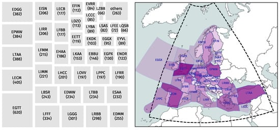 Based on the position from the sampled trajectory (every 30 s), we can construct emission statistics categorized by different flight information (FIR) regions, which are part of or affiliated with EUROCONTROL. On the left-hand side of Figure 9, total CO2 emission (in million kg) in January 2020 for each FIR was qualified. On the right-hand side of the Figure, emissions results are illustrated. The quantity difference is reflected by the changes in shades of colors.