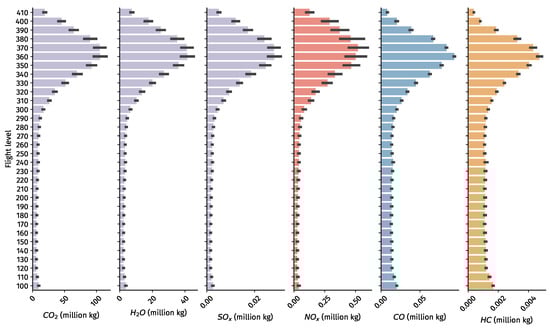In Figure 10, all types of emissions at each flight level are shown. Among all six types of emissions, CO2, H2O, and SOx are linearly related to fuel consumption. Hence, they show the same distribution at different magnitudes. The nonlinearity is more clear for CO and HC, where higher percentages of emissions are observed at low altitudes. This is related to the fact that, at these flight phases, engines generally operate at lower thrusts. For NOx, on the contrary, slightly more emissions are produced at higher altitudes, where the engines’ operating temperatures are higher.