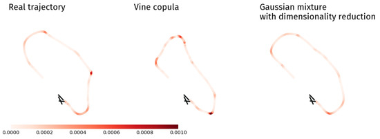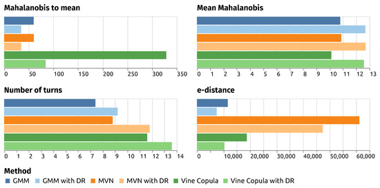The mean number of turns calculated for the real trajectories dataset is 7.9, and both GMM and MVN without DR give very close results. Covariance matrices from Gaussian distributions are less complex than the dependency pattern of a vine copula, and may actually filter the wiggles. However, the DR increases the number of turns and
