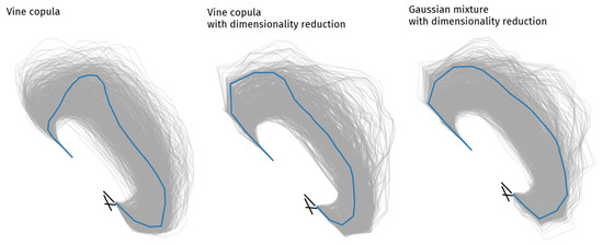 Because of its strong assumptions, the MVN gives the worst results in every way. GMM and vine copulas appears to be close, but the former estimates better the overall distribution, and provides less wiggly trajectories. GMM generates more realistic shapes on average. The copula is certainly the most sensitive method to the large dimension, and it also observes the greater improvement when using the DR. Their main drawback comes from the estimation of the area around the center of the flow; i.e. the standard procedure area. As seen on