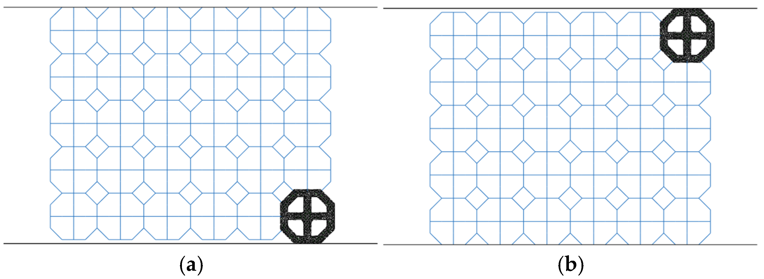The full lattice comprises 190 octagonal unit cells. The structure is intended to absorb energy at high strain rates; accordingly, it is sandwiched between two plates that serve solely to transmit load to the lattice. Because the plates’ local response is not of interest here, and given their role in the system, they are modeled as rigid bodies.