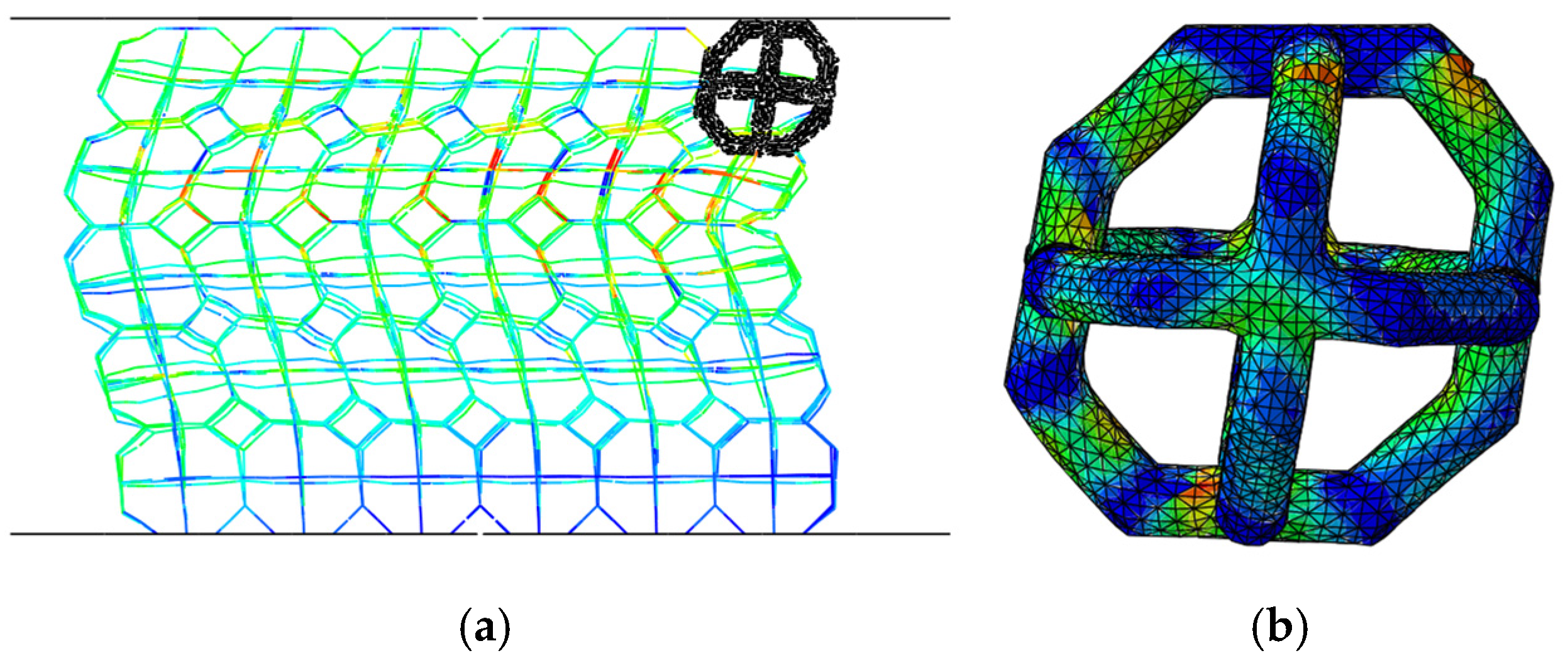 Figure 5b). The 3D cell exhibits a stress pattern consistent with the observed deformation mode: stress concentrations develop at the joints where struts meet and in regions experiencing the greatest distortion. As compression proceeds, these hotspots trigger rapid local failure, leading to sudden breakage in those areas.