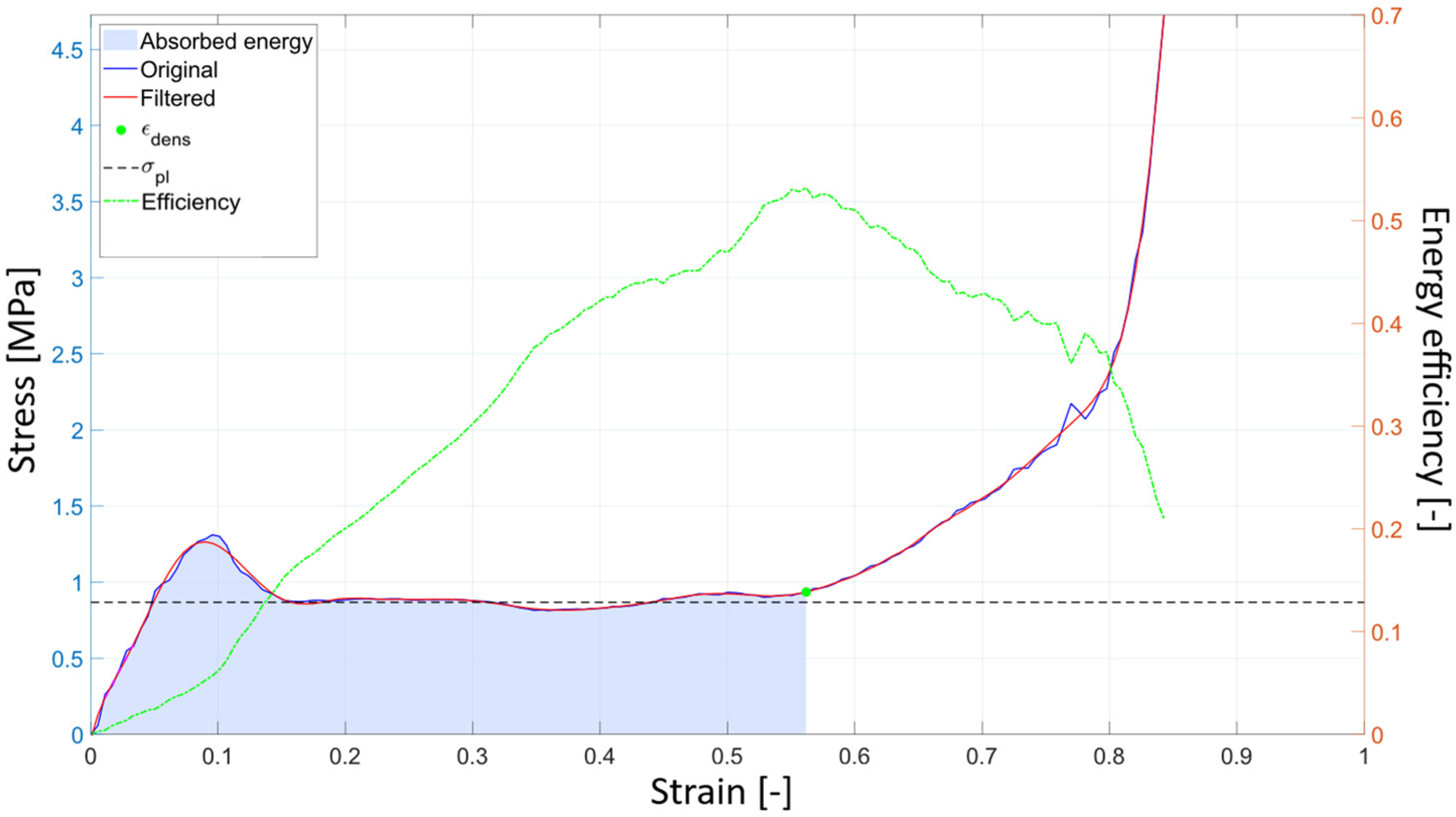 The plateau stress is indicated by the horizontal dashed line and is computed as the mean stress over the interval where the curve flattens, up to the onset of densification. The densification strain is identified via the lattice energy efficiency, shown as the green curve. This dimensionless quantity represents the ratio between the energy absorbed by the lattice and the energy that an ideal absorber with identical geometric characteristics would absorb. Densification is taken to occur at the maximum of this efficiency curve, beyond which the absorber’s effectiveness decreases.