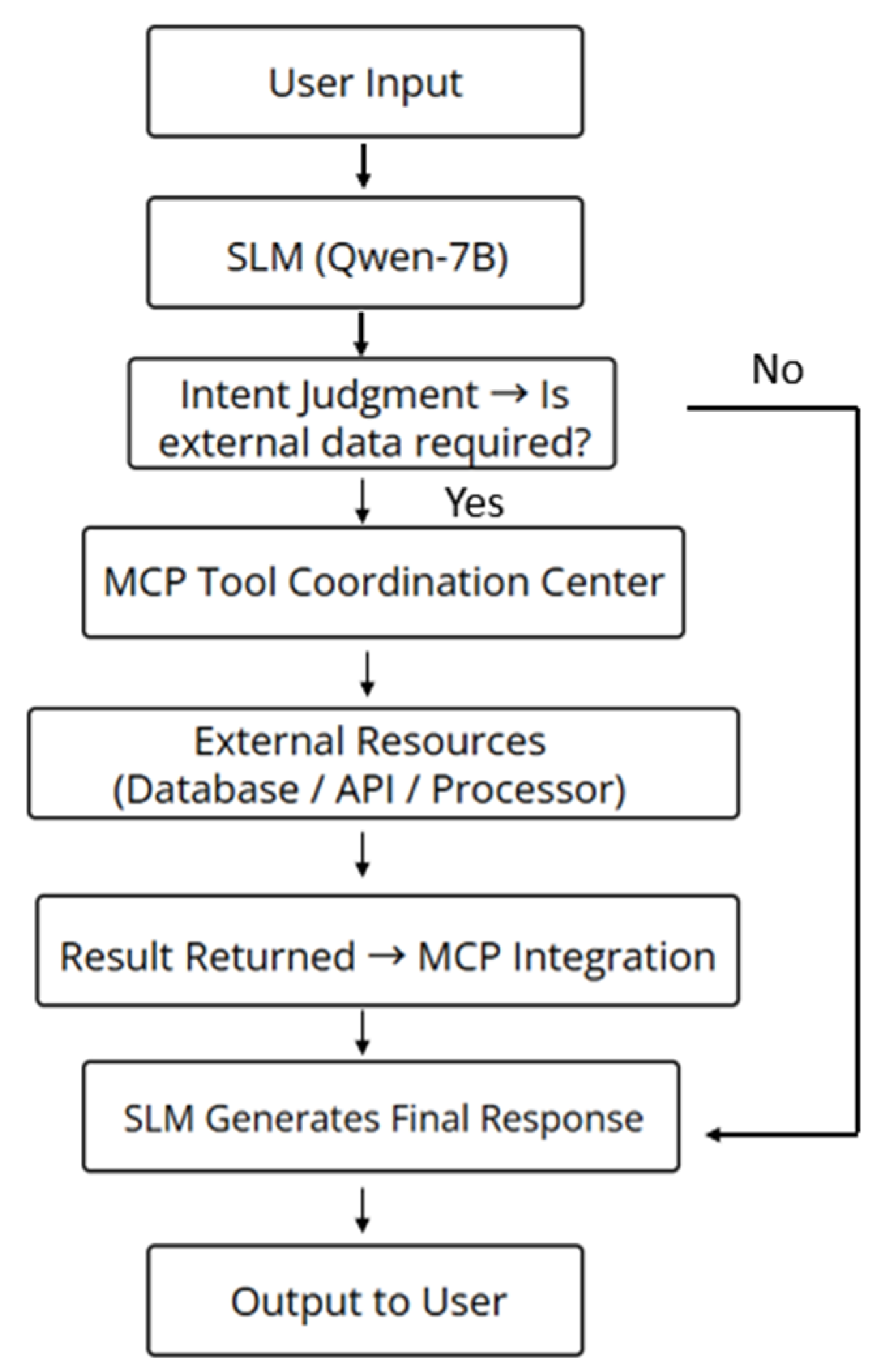 Figure 1, user input is first processed by the SLM (Qwen-7B) to determine intent. If external data is required, the MCP tool coordination center is responsible for invoking the corresponding external resources (such as databases, APIs, or processors) and integrating the returned results back into the SLM. The model then generates the final response. If no external data is needed, the SLM directly outputs the response to the user.