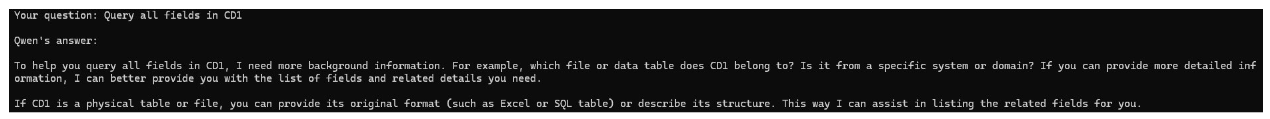 Figure 2), Qwen-7B provided a semantic explanation, indicating that additional data sources or structural descriptions (such as SQL tables or Excel files) were required to provide the column information. At this stage, the model lacked actual access to external databases and could only perform reasoning and guidance at the textual level.