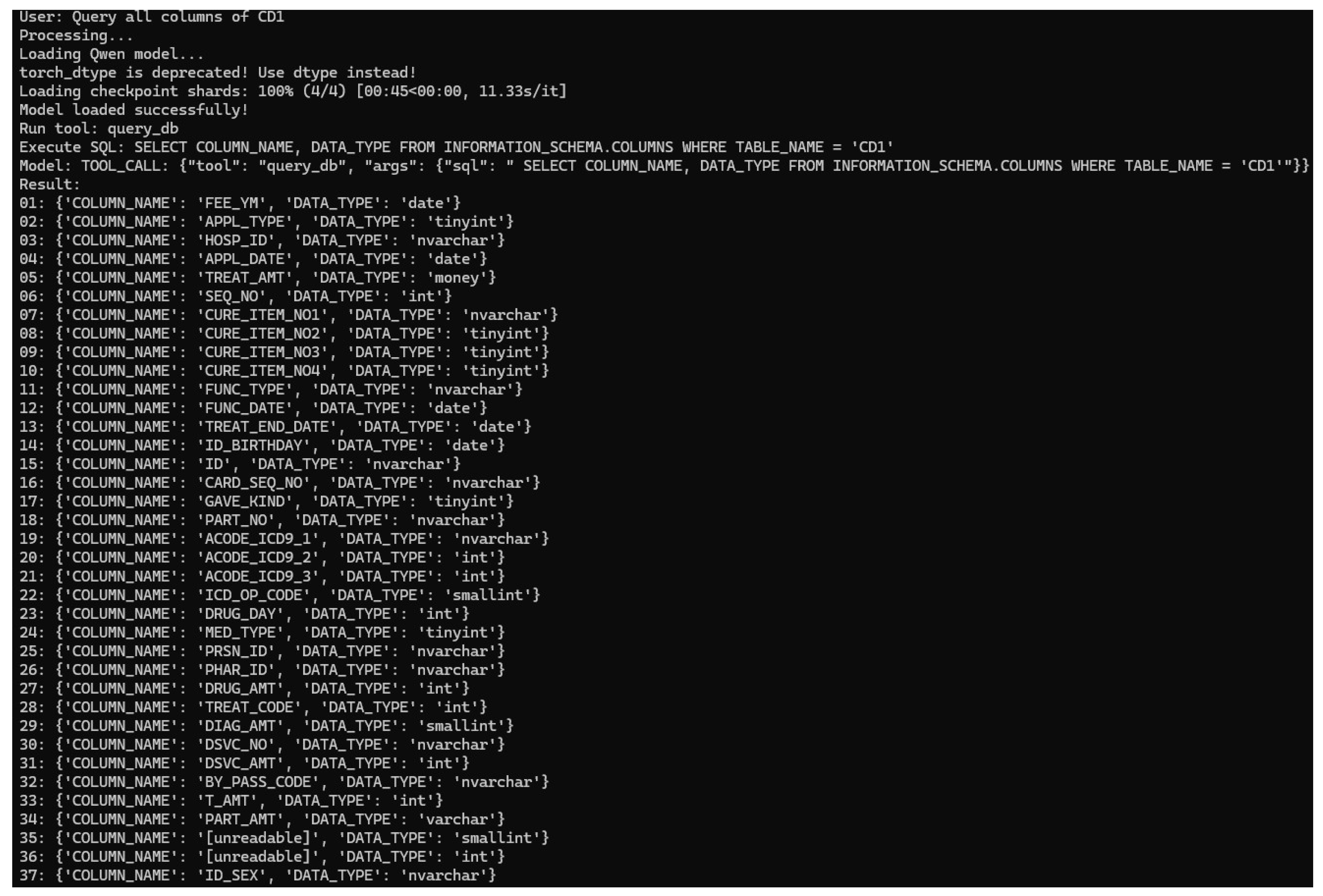 This action was executed using MCP’s query_db tool, successfully returning the query results from the database, including the column names and corresponding data types in the CD1 table (e.g., FEE_YM: date, HOSP_ID: nvarchar, TREAT_AMT: int, etc.). This demonstrates that the model not only understands the query intent but can also autonomously invoke external resources through MCP to complete the task.