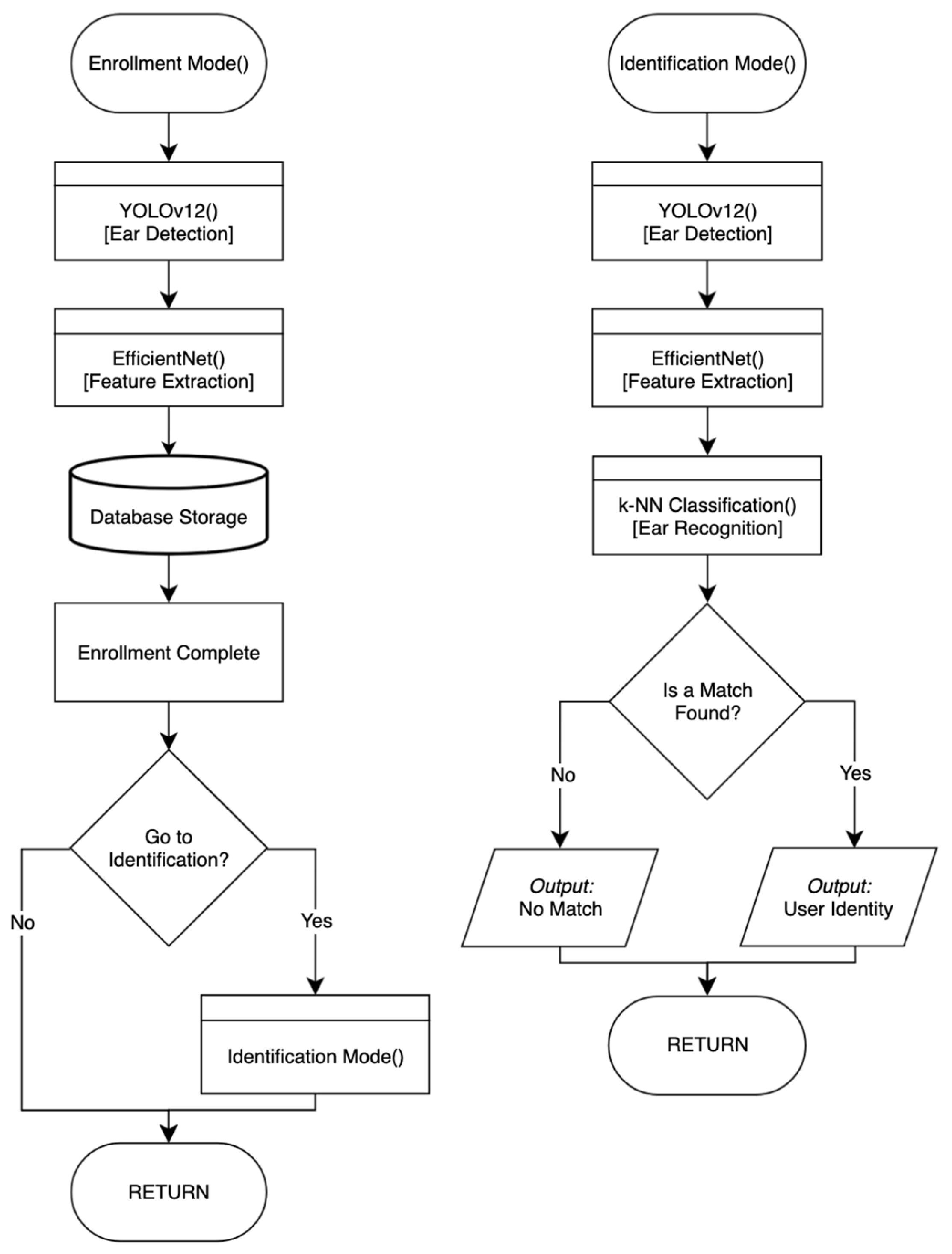 - Identification phase: All 13 participants underwent recognition. Upon detection, a three-second video stream (up to 45 frames) of the ear was recorded and feature-extracted. Identification results from valid frames were aggregated to determine the outcome (match or no match).