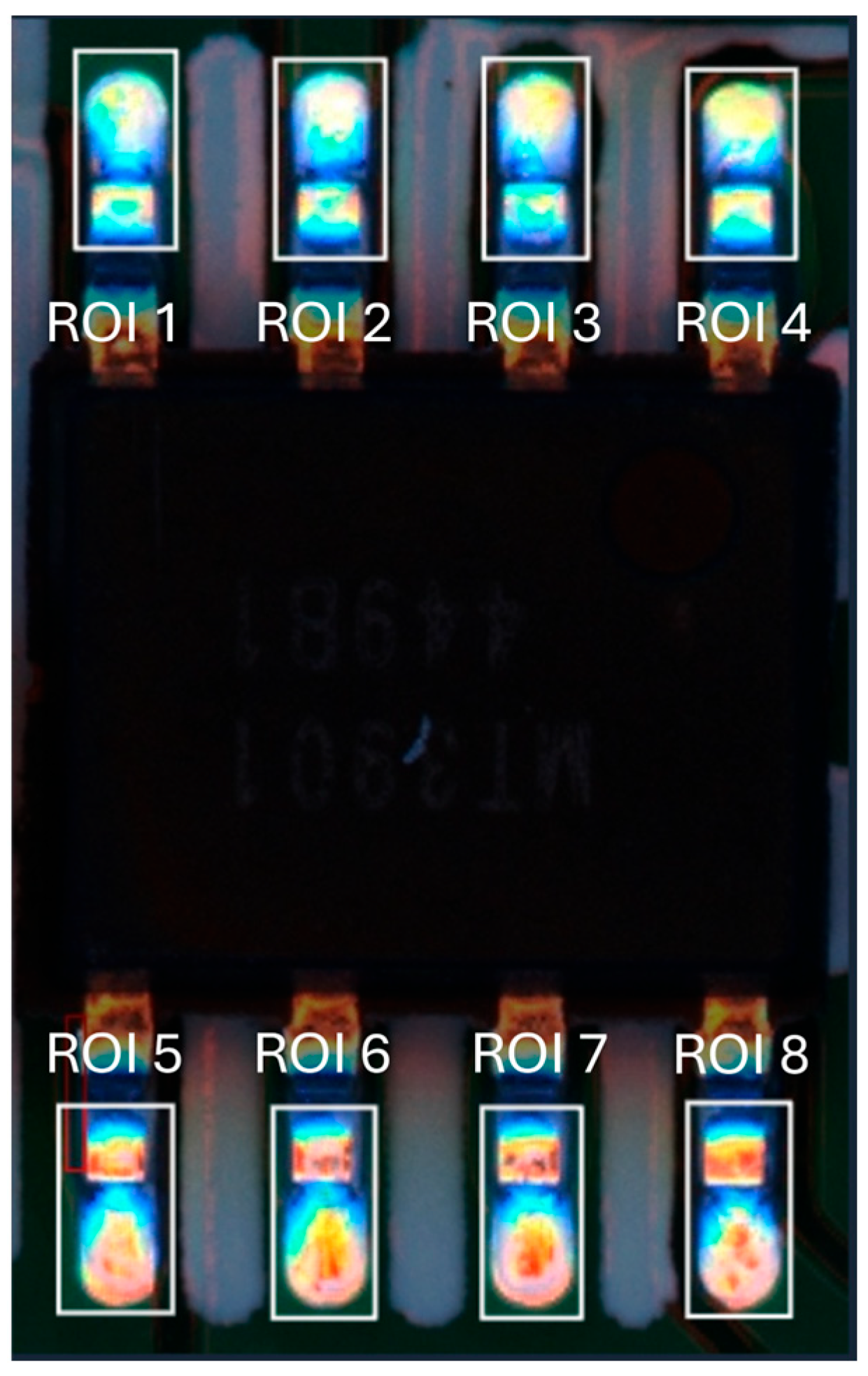Figure 1 shows ROIs corresponding to all eight pins of the VR IC, highlighting the areas used for solder joint inspection. Each ROI was carefully defined to include only the solderable tip of the pin, rather than the entire pin body. VR IC pins consist of a metallic lead providing mechanical support and electrical connection, and a solderable tip at the end to ensure reliable contact with the PCB pad. Since the pin body has minimal influence on solder quality, focusing the ROIs on the solderable tips allows the model to concentrate on the critical regions for defect detection, avoiding irrelevant information that could interfere with feature learning and improving classification accuracy. The cropped single-pin ROI images had a resolution of approximately 55 × 87 pixels, precisely covering the solderable tip to ensure that the critical solder features were retained while minimizing background interference.