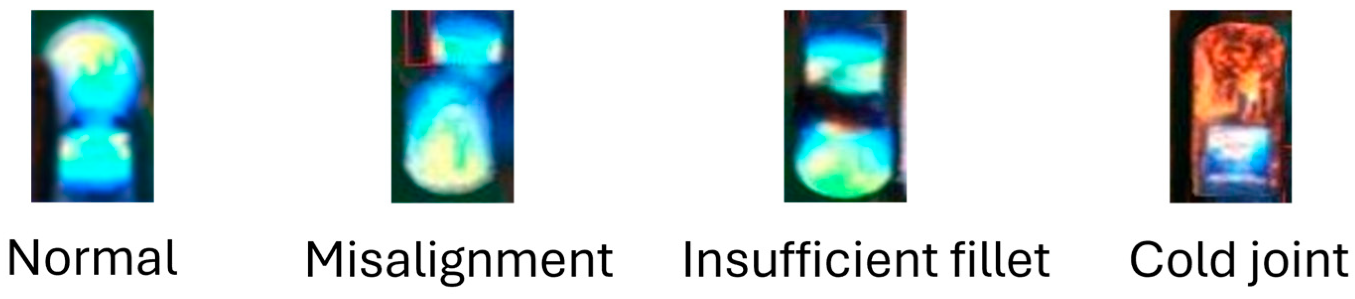 Figure 2 shows the examples of the normal type and three defect types, illustrating the visual characteristics used for classification. Each cropped solder joint image was treated as an individual sample and subsequently used for model training and testing. The solder joints were classified into four categories based on their visual characteristics: normal, misalignment (solder joint center offset from the pad center by more than one-third of the pad width), insufficient fillet (coverage less than 75%), and cold joint (surface cracks or discoloration). Representative samples from each defect type were distributed between training and test datasets to ensure exposure to all categories, including less common defects. Colors indicate the visual solder condition in the image: blue represents joints where solder is visibly present (including normal, misaligned, and insufficient solder joints), while orange represents cold joints, where the solder is severely insufficient or nearly absent, resulting in little to no visible solder in the image.