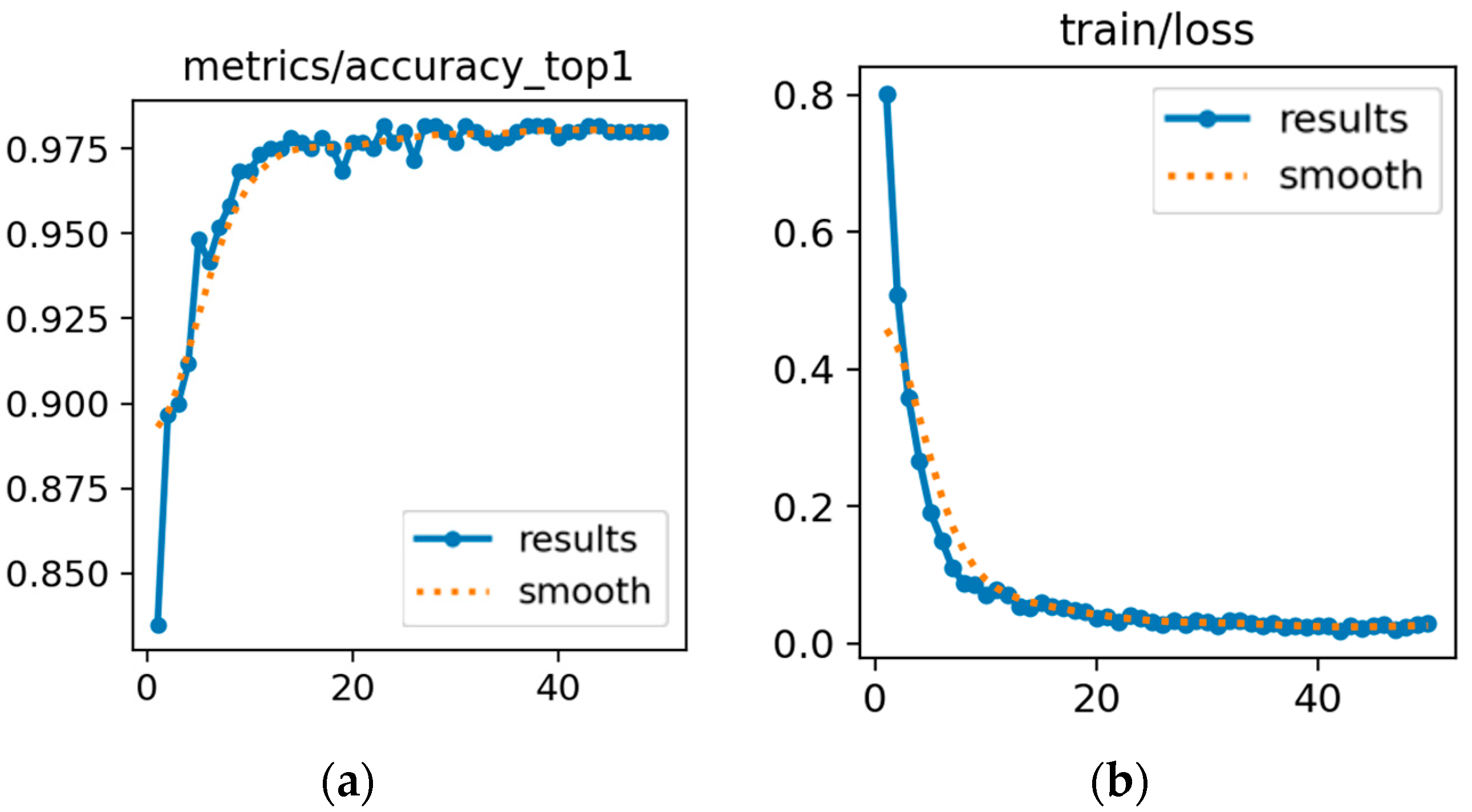 Figure 3 shows the trends in top-1 accuracy and training loss over training cycles, illustrating that the model learned effectively and converged stably as the loss decreased and accuracy increased. During training, the model achieved consistently high accuracy, and although minor confusions may exist between visually similar categories, the curves indicate that it was learning to differentiate between the solder joint types. These observations suggest that the model captured the subtle features of VR IC solder joints and formed a solid basis for the subsequent testing phase. Solid blue lines represent the original metric values recorded at each epoch, while dashed orange lines represent moving-averaged curves, highlighting overall training trends.