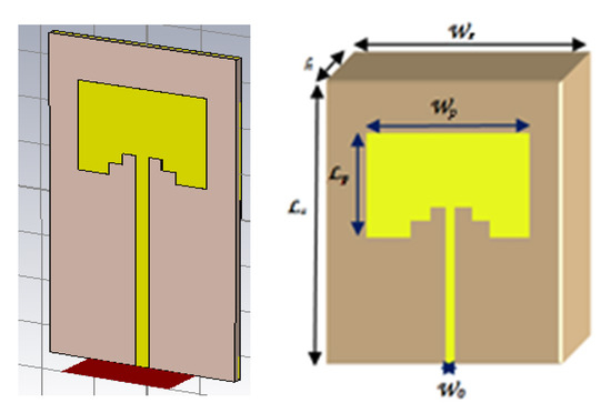 Figure 1. This structure consists of a radiating element with length Lp and width Wp, with notches, fed by a microstrip line. It is deposited on an FR-4 type dielectric substrate with dielectric permittivity εr = 4.3, of dimensions Ls and Ws and thickness h. The ground plane covers the substrate’s whole rear face.