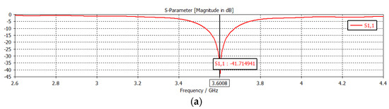 Figure 6c), shows that the reflected power contains three resonant frequencies—3.596 GHz, 4.275 GHz, and 4.91 GHz—with levels equal to −16.86 dB, 10.29 dB, and −43 dB, respectively.