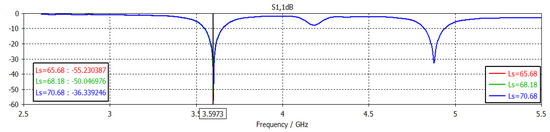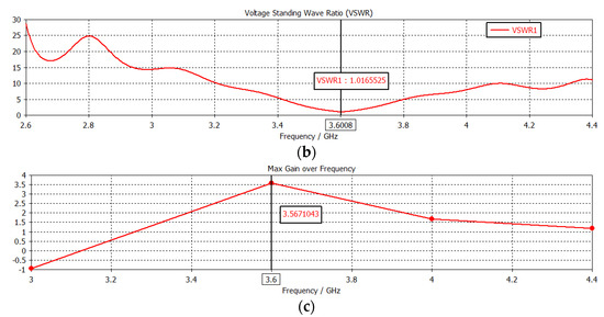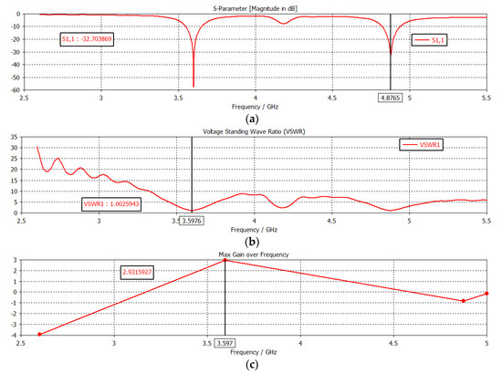 Figure 13a–c, respectively, we represent the return loss, the VSWR, and the gain of the final dual-band antenna according to the last parametric study of the length Ls.