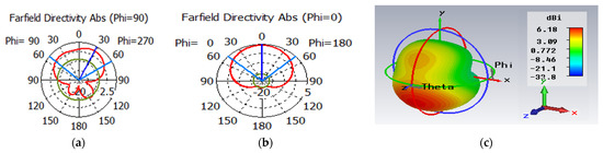 Figure 3a–c represents, respectively, the polar radiation patterns, in 2D and 3D, of the antenna at the resonant frequency 3.6 GHz.