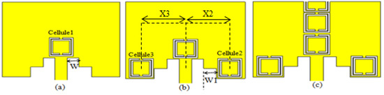 Figure 6 presents three proposals for the radiating element of the initial antenna combined with CSRR cells. We have modified the number of CSRR cells on the radiating element in order to see their influences on the adaptation, while keeping the other antenna parameters unchanged.