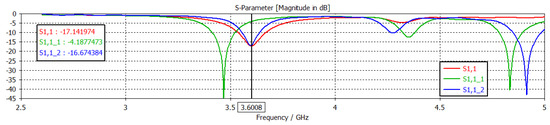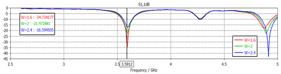 We notice that the level of the return loss is inversely proportional to the notch width W for the first peak, where the decrease of the width W leads to an increase of the S11 level. For the second peak, the return loss increases when W increases. The best obtained result corresponds to W = 1.6 mm, such that the return loss reaches a value lower than −34.73 dB at the frequency 3.5912 GHz.