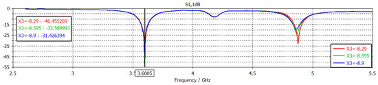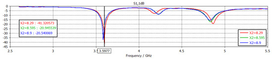 From the obtained results, we can visualize that the increase of the return loss level is inversely proportional to the X2 distance. We also observe a slight improvement in the resonance frequency that becomes to equal 3.5977 GHz, almost equal to the desired resonance frequency 3.6 GHz.