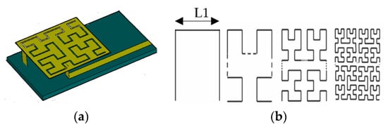 (a) Proposed antenna structure, (b) the first four iterations of Hilbert’s fractal form.